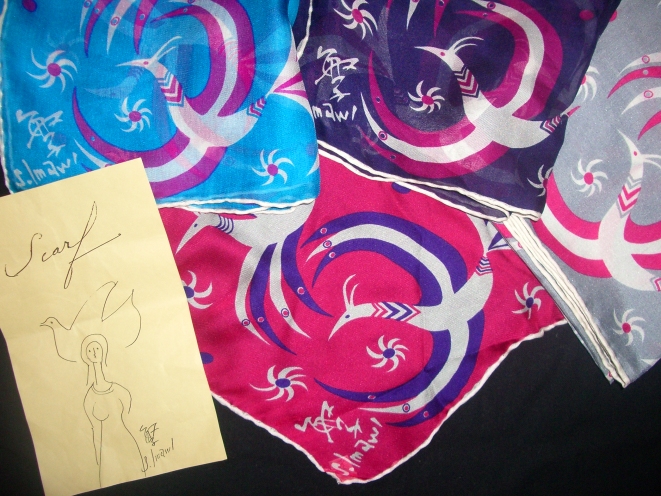 家に帰って、引き出しの奥から出してみたスカーフ。今井が随分前(20年位前?)にデザインしたものです。同じ柄で色違いのこのスカーフは、色ごとにシルクの素材感も違います。作られたばかりの頃は当館でも販売していましたが、既に完売しております。
