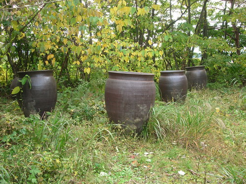 この写真の大甕(以前当館にいらっしゃったことのある方はご存知だと思いますが)庭のあちこちに点在しています。よくお客様に「これは何ですか?」と訊かれる謎の物体!?実はこれ、長崎から運ばれて来た唐津焼の水瓶です。昔、主に雨水を溜めたり、醤油・味噌等を貯蔵したものだとか。多少の違いはありますが、どれも大きくて、大人の肩から胸位までの高さがあり、かなりの重さ!冬は中に溜まった水が凍って甕が割れないように、水を抜く作業が必要なのですが、これが重労働なのです!!